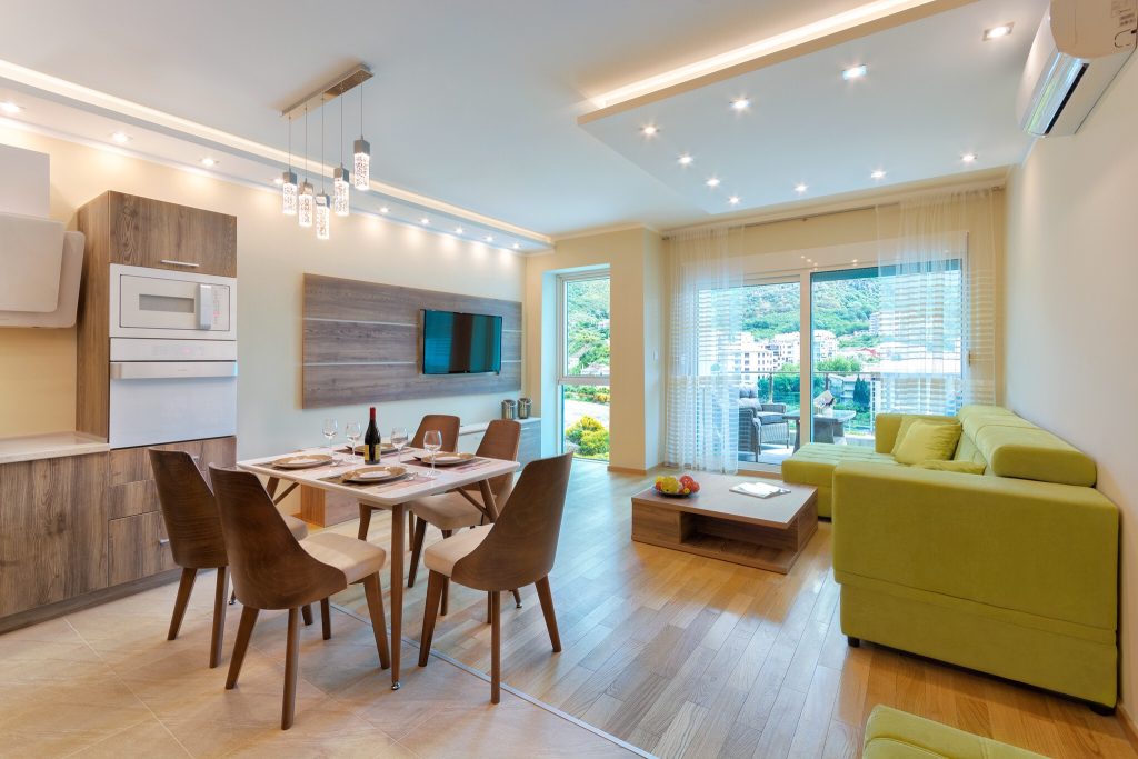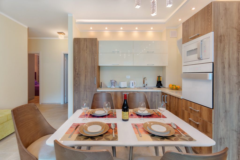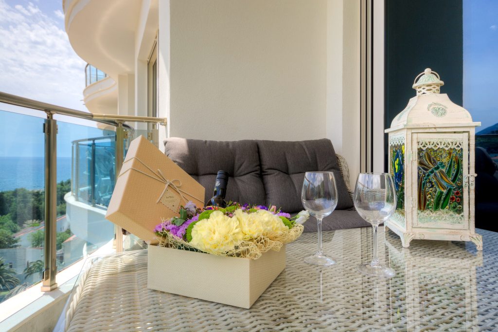 Квартира с элегантным дизайном и продуманной атмосферой средиземноморского уюта. С террасы открывается великолепный вид на горы и боковой вид на море, а южная экспозиция дарит роскошные закаты над Адриатикой.